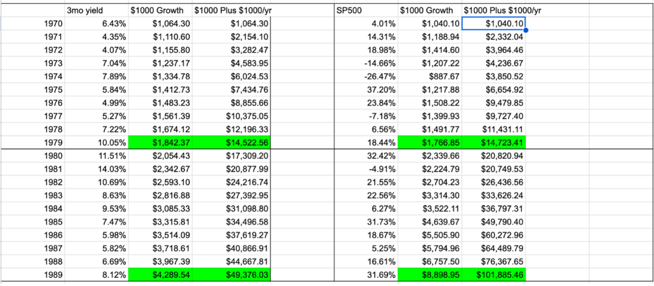 At the end of 1979, the risk-free investor who started with $1,000 ended with $1,842, and the stock investor ended with $1,767. So yes, the risk-free investor won in this scenario, especially when we consider that they were putting zero risk on their money.